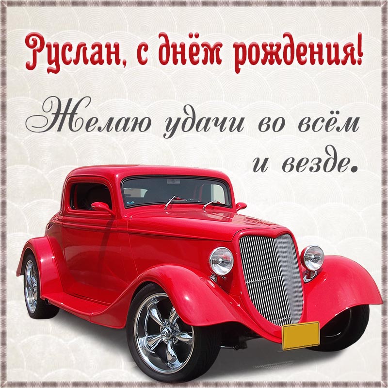 Открытка на день рождения. Автомобиль и пожелание удачи во всем и везде Руслану