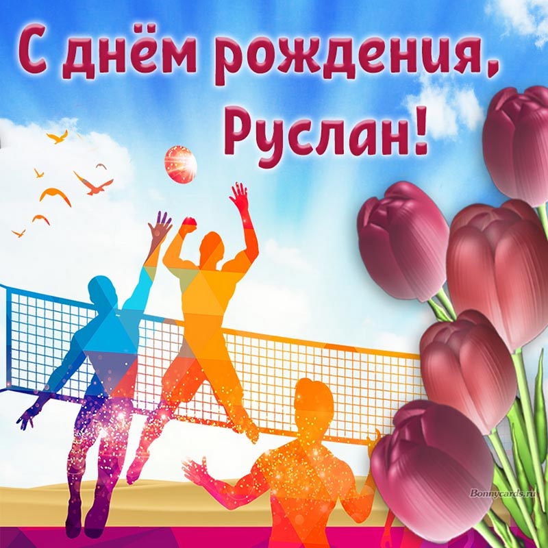 Картинка со спортсменами и тюльпанами на день рождения Руслану