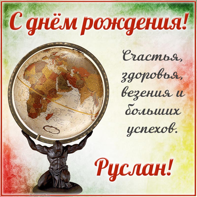 Открытка на день рождения - глобус и душевное пожелание больших успехов Руслану