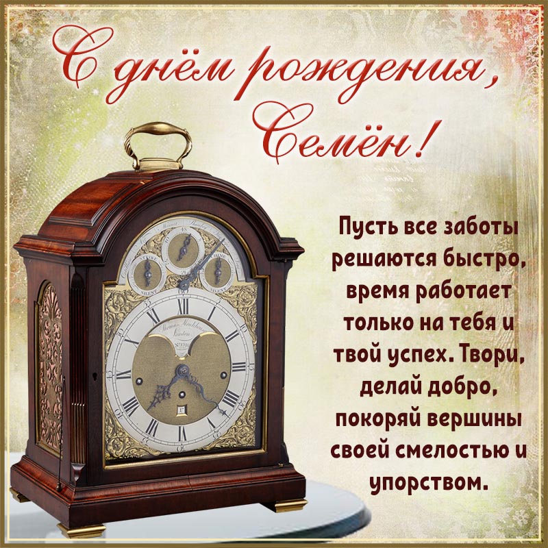 Открытка Семёну - старинные часы и душевное пожелание на день рождения
