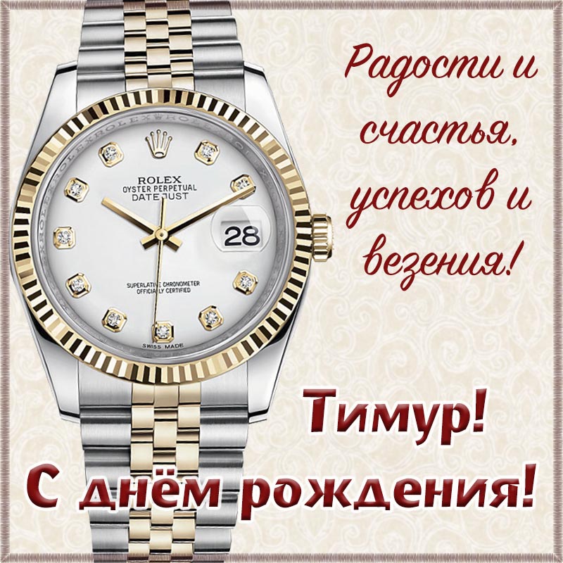 Открытка - стильные часы и поздравление Тимуру на день рождения