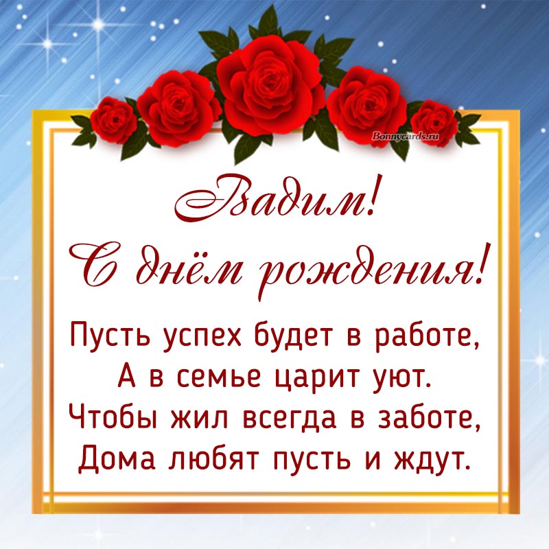 Открытка - розочки и пожелание в рамочке Вадиму на день рождения