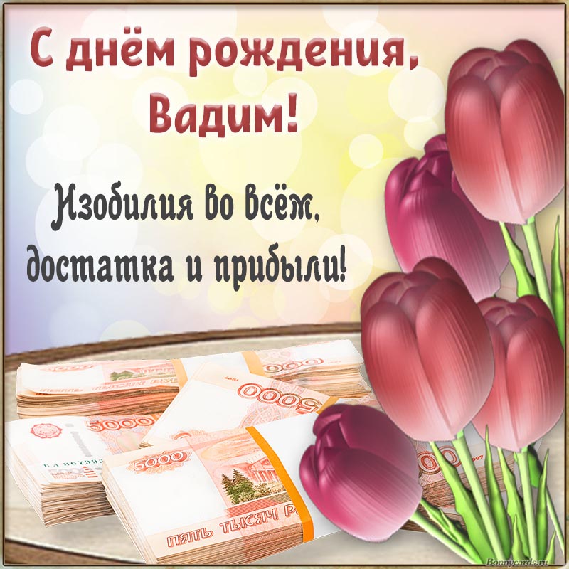 Привлекательная открытка с тюльпанами и деньгами Вадиму на день рождения