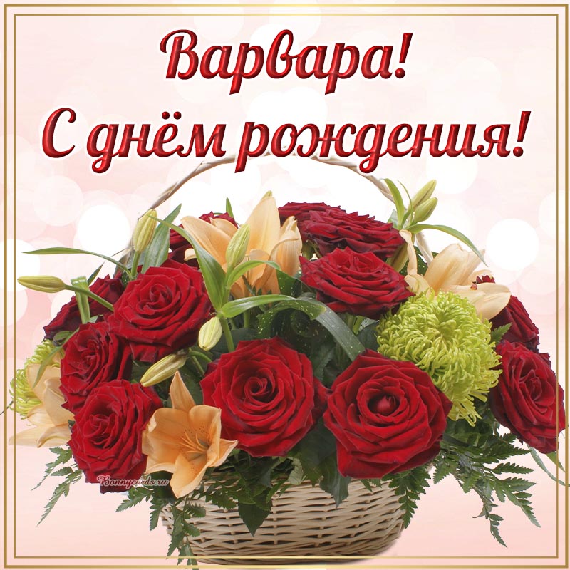 Открытка - цветы в корзине на светлом фоне Варваре на день рождения