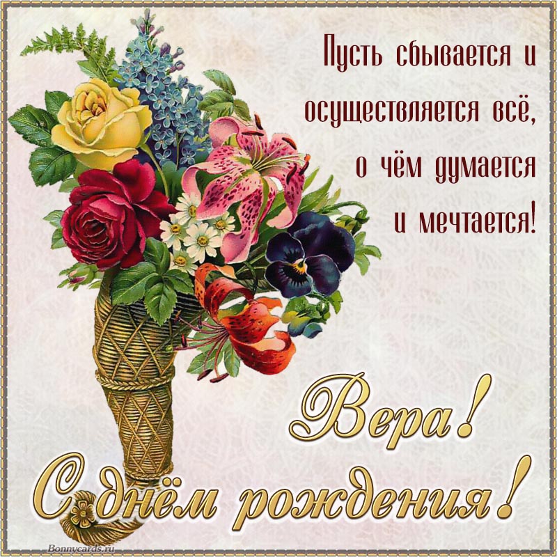 Открытка с цветами на светлом фоне Вере на день рождения.
