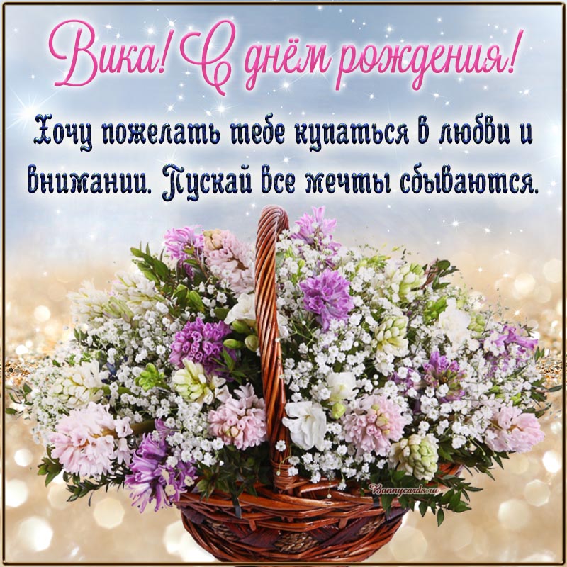 Открытка на день рождения - букетик и пожелание Вике купаться в любви и внимании