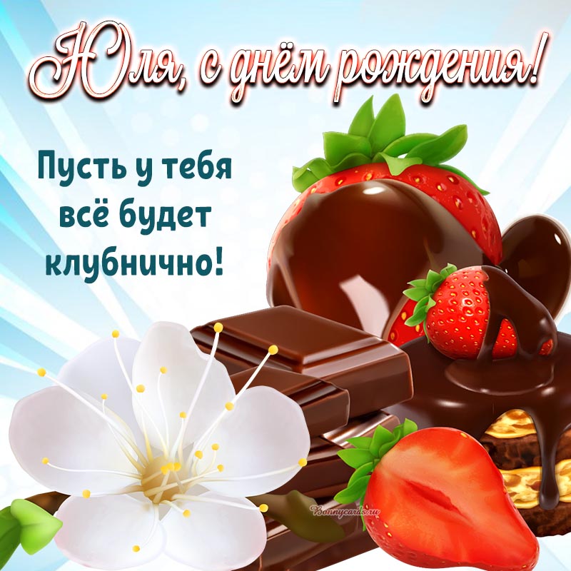 Чарующая картинка с шоколадом, цветком и клубникой Юле на день рождения